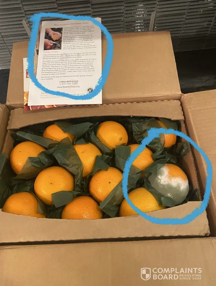 Desired outcome: Hale Groves is resend a box of fruit ( of lesser value) to replace the moldy mushy fruit.Hale Groves doesn’t care about acknowledging sender on boxes sent out, so they aren’t doing anything.