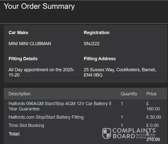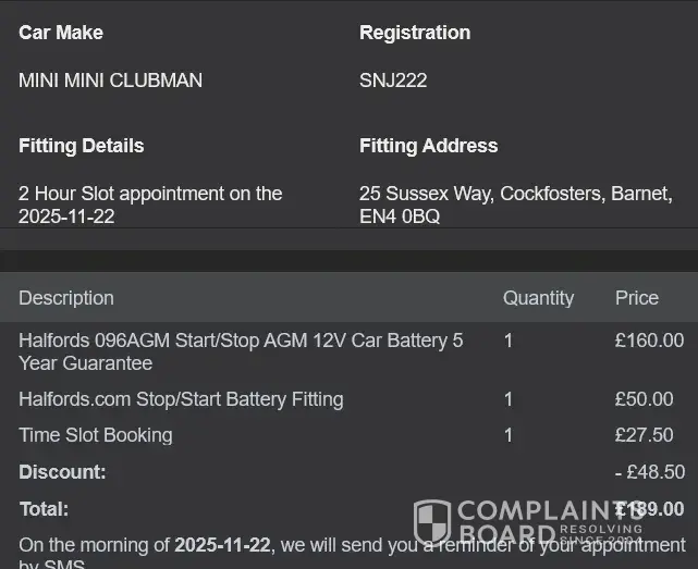 Case Number 27725981 On the 12/12/2025 I booked and paid for two tyres `Avon All season (205/55/R16 )` my appointment was at Congleton on 13/12/25 at 13.30 After payment was confirmed I received a message telling me that because of a technical issue with Halford system there was a problem and asked me to phone a 330 number .I checked this number on Google ...