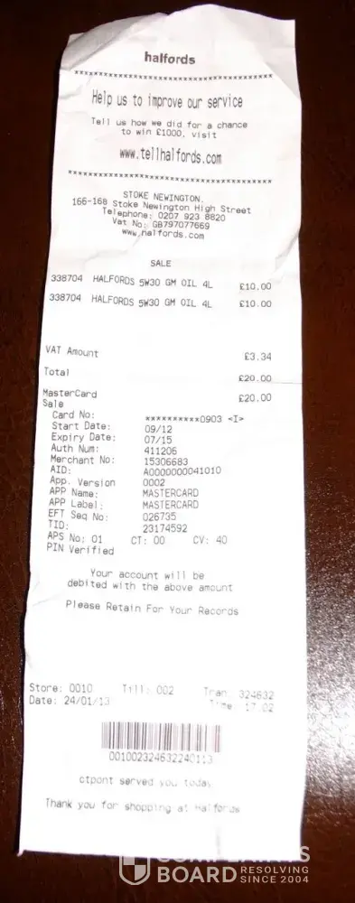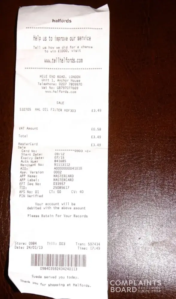 Before I begin I ask you to read the complaint in full as previously I have received responses which indicate either the email was not read or it the reply was doing using AI and has not been actually understood. For clarity, I have attached a copy of an invoice which I have paid for which proves that I had the car fixed independently and that Halfords did...