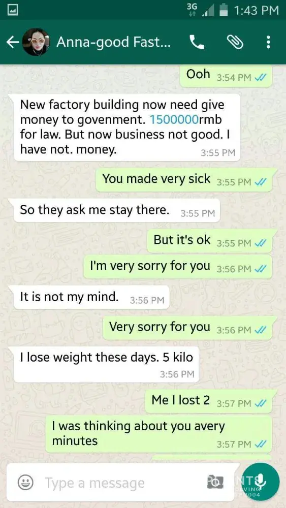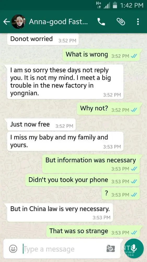 Attached is the what's app screenshut, she said she was arrested by the chinese government.