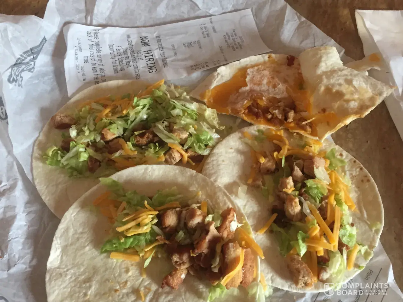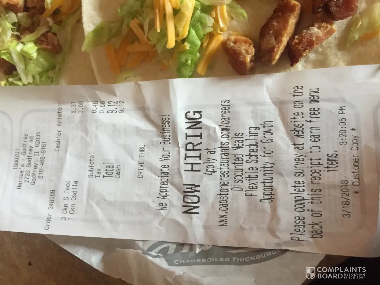 I went through the drive thru and ordered 3 chicken soft tacos and a chicken quesadilla. I waited almost 10 minutes in the drive thru expecting to have a fresh and hot meal. To my disappointment, I had 3 poorly made tacos with what looks like mystery meat due to the chicken being so old and dried out. A chicken quesadilla that had barely any chicken in it, that too included the extremely old and dried chicken. I frequently visit hardees for the chicken soft tacos, however, the past couple trips have been awful. The trip before this last one the chicken tacos had soggy taco shells and liquid draining from the taco. Obviously, I have had to throw out the past two orders. I will not visit the location again. I live in Grafton, IL which is 20 minutes from the location so I can not easily just go back for a refund or fresh food. I would like a refund of my purchase. Please contact me via email at: