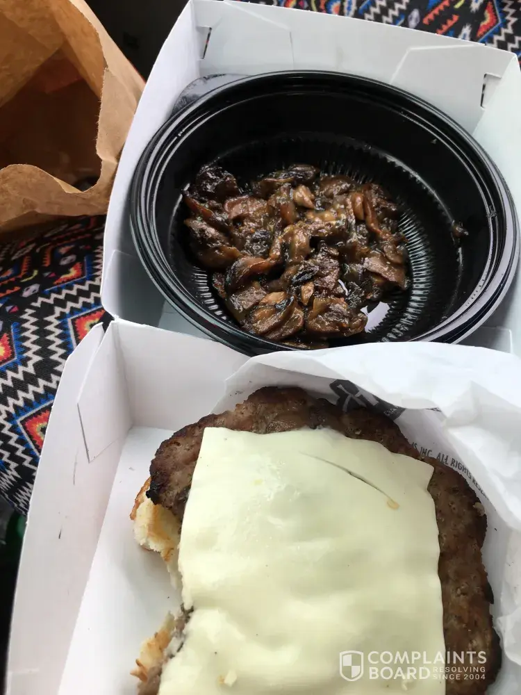 Read full complaintAsked for a mushroom swiss and they gave me a burger without mushrooms and would not correct the problem