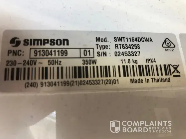RE: Simpson Washing Machine Model SWT1154DCWA Fault.