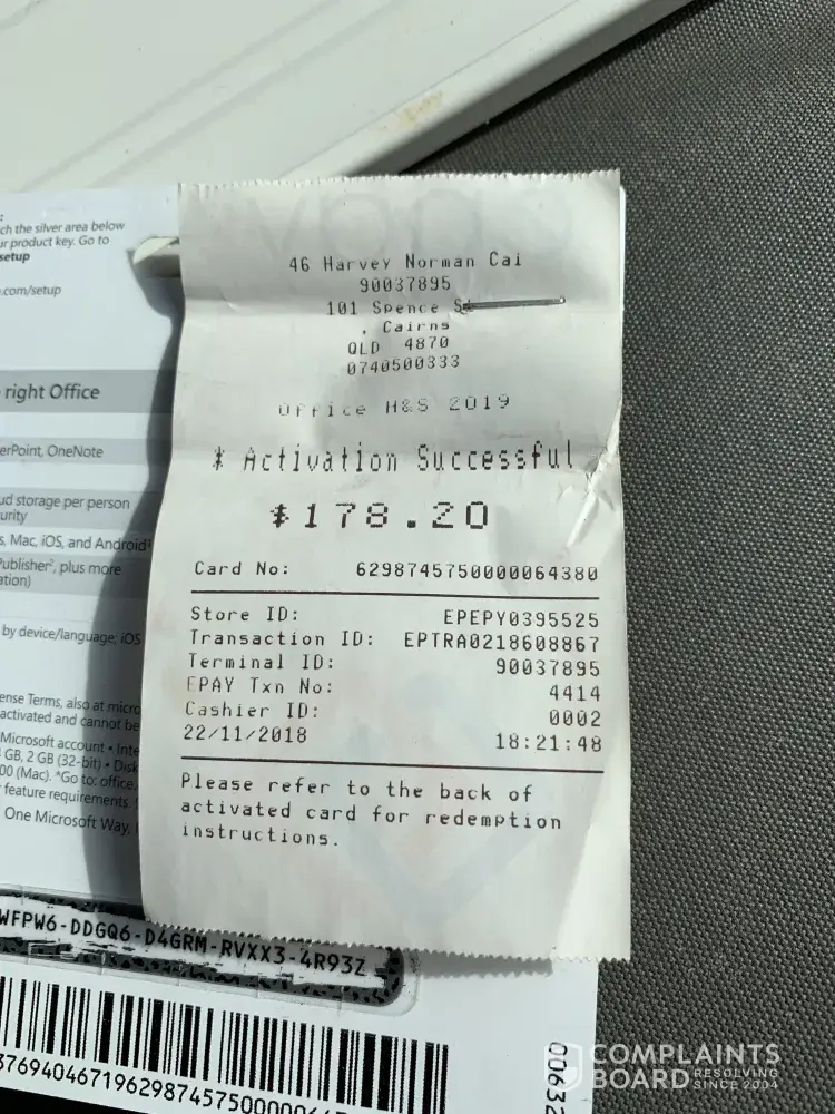 Purchased this product from Harvey Norman cairns and when I have tried to activate it it won't work. Keeps telling me it's not a valid code. Phoned Microsoft and they advised that it is not a valid activation code and that I had to take it back to the place of purchase for a refund. So I went back to the cairns store and was advised that you only have 24 hrs to report any problems with the product, which I was no told when purchasing, and that there was nothing they could do about it. I'm not asking for anything other than having the product I bought working. So I am respectfully asking either a refund or a replacement. I still have the receipt. Transaction code is EPTRA0218608867.