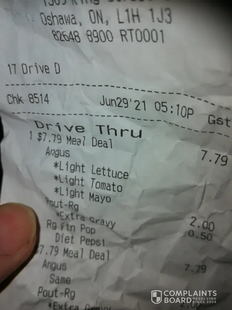 Desired outcome: 1. Apology 2. Coupon for 2 Angus meal deals