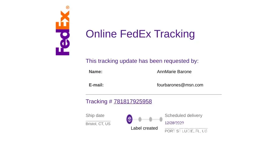 Hazeltons stating my order was shipped via FedEx.