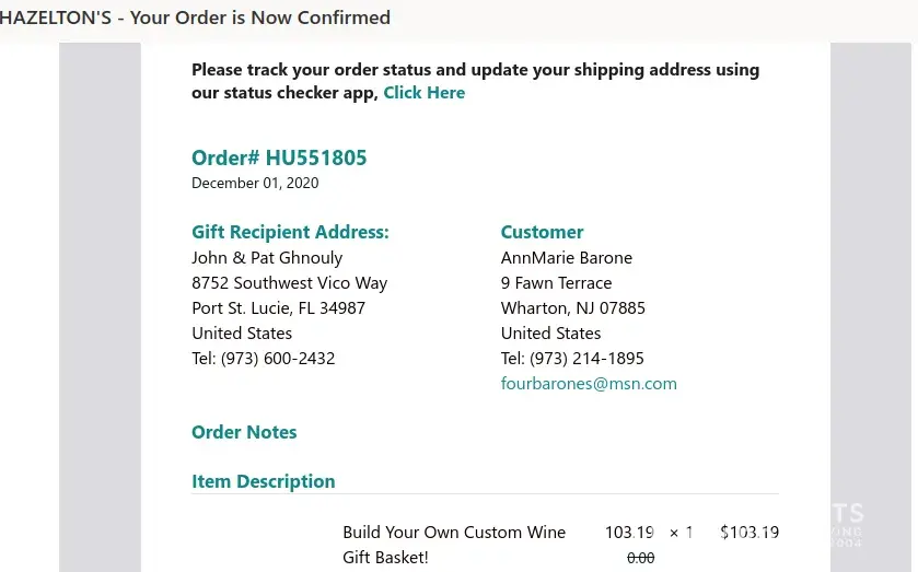 I ordered a gift basket from this company on December 19, 2020 and paid for the expedited shipping. My American Express card was billed and paid on December 19, 2020 also. On December 27, 2020 I look on the website of the company and noted that nothing had been done on the order. Contacting the company has been of no use as you only receive voice mail. I have written twice and received no response. n Order number is HU567678. Hazelton's never delivered the package or responded to requests for assistance.