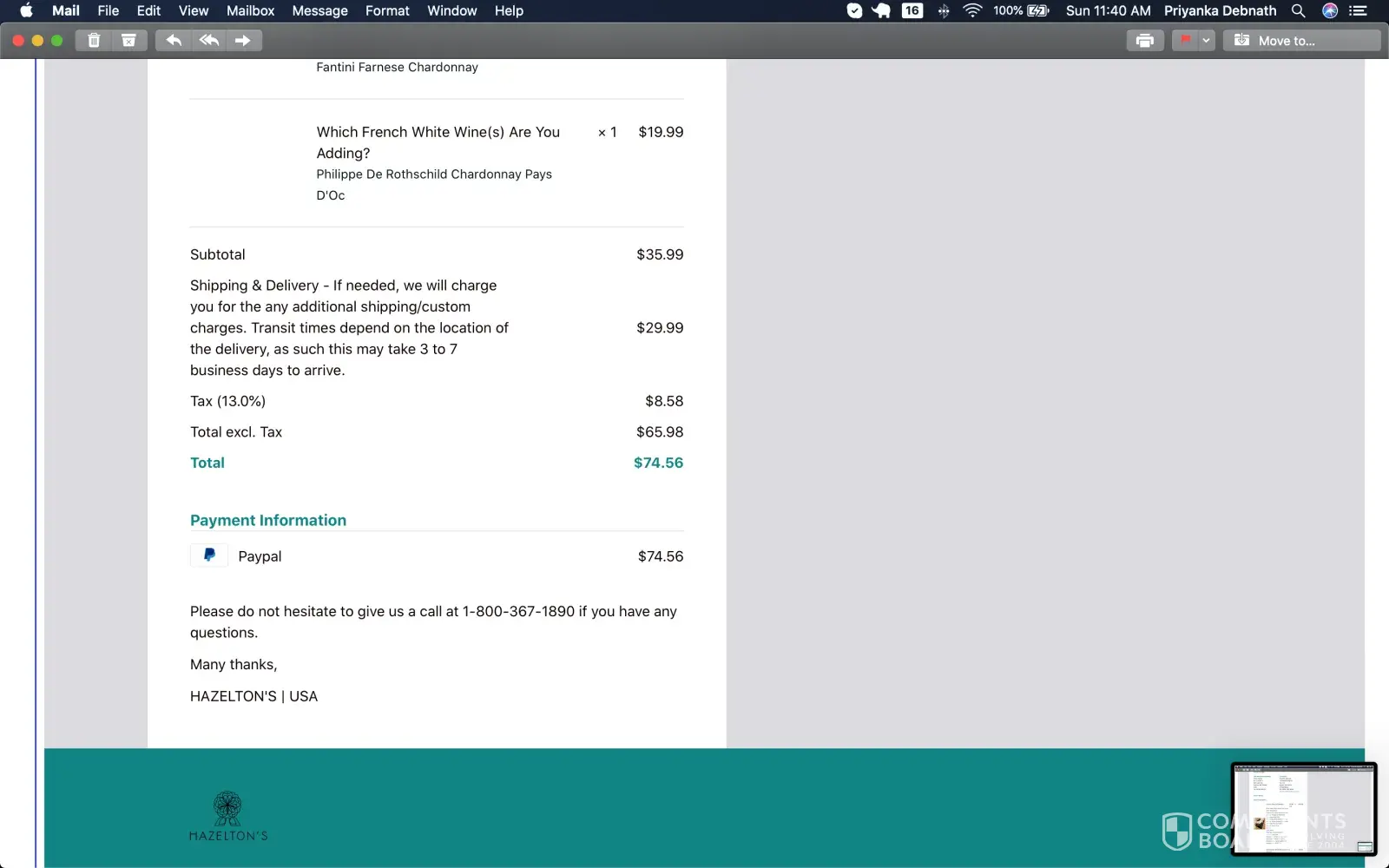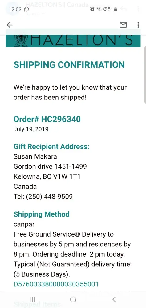 I ordered a gift basket on 6/24/20 as a birthday surprise from the Hazelton's CA website. My order (HU33337) was to be delivered 6/26/20 the birthday of a friend. After the order was paid and completed I received notification that the order would not be delivered until the following Tuesday 6/30/20. To date 7/1/20, the order has not been delivered. At the bottom of my receipt it states "Please do not hesitate to give us a call at [protected] if you have any questions." That number is a voicemail that instructs customers to email the company for customer service. The email is a "live agent" that does not respond. I can't seem to contact anyone.