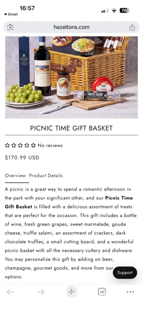 I purchased the product “Picnic Time Gift Basket” from hazeltons.com. According to the product page, the order included not only food items, but also the picnic basket itself with the necessary cutlery and dishware. However, when the package was delivered, the picnic basket was missing. I received only part of the order, despite paying for a product that was advertised as including the basket. The total order value was approximately $260, and the basket was one of the main reasons I placed the order.