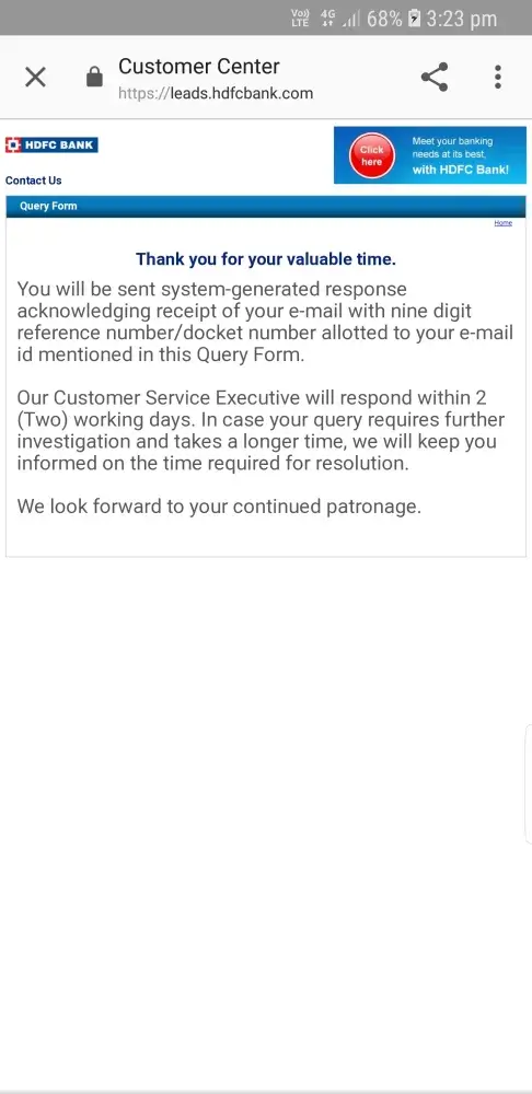 We regret to inform you that we could not complete your transaction. For more details, please contact your nearest HDFC Bank Branch, or our PhoneBanking service. You can also write to us at : https://leads.hdfcbank.com/applications/webforms/apply/HDFC_CustomerCenter/CustomerCenter.aspx