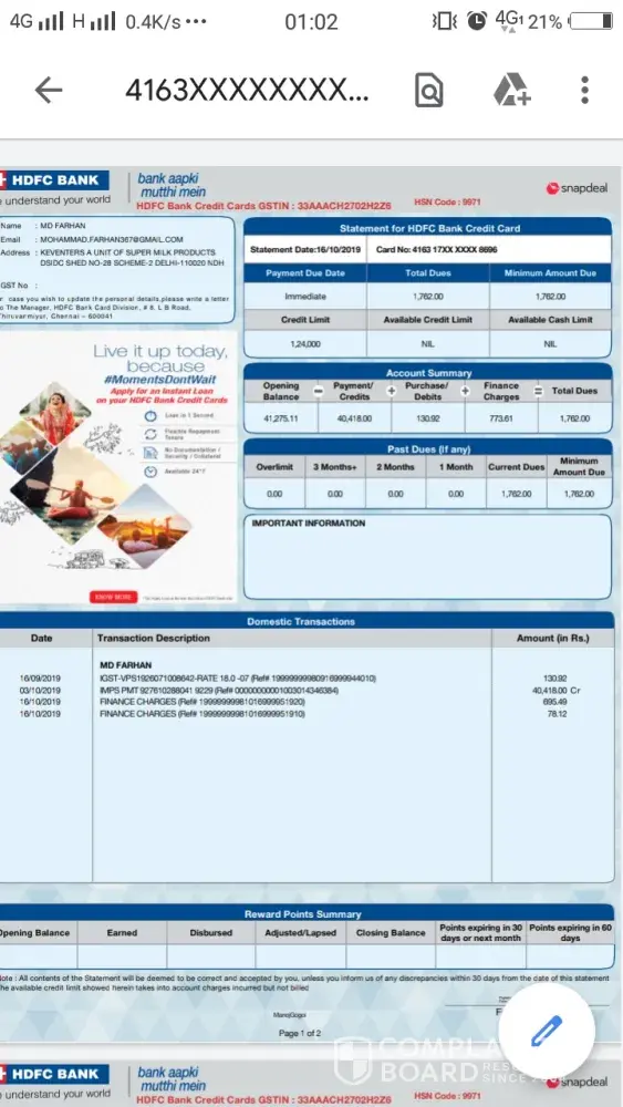 I make the payment for credit card settlement on 16th October 2019. Till date I didn't receive the settlement letter. I follow up with HDFC staff several times. Nowadays there are not picking my call also.