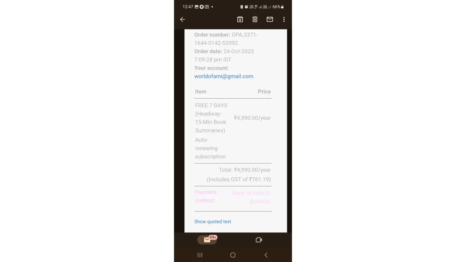 I had paid for this app on 24th October. 2023 . It's less than 24 hours. I had paid initially 4990/year. It showed not subscribed but my money got deducted. Same time I purchased again for 2079 . The money got deducted even when on free trial period. It is not even 24 hours. I have cancelled my subscription . I want my money refund. I have contacted Google play . They have denied refund and have told to contact the app developer. I have emailed the same details . In your policy it is written you can get refund within 24 hours.I want my money back .I have attached all the invoice and receipt.