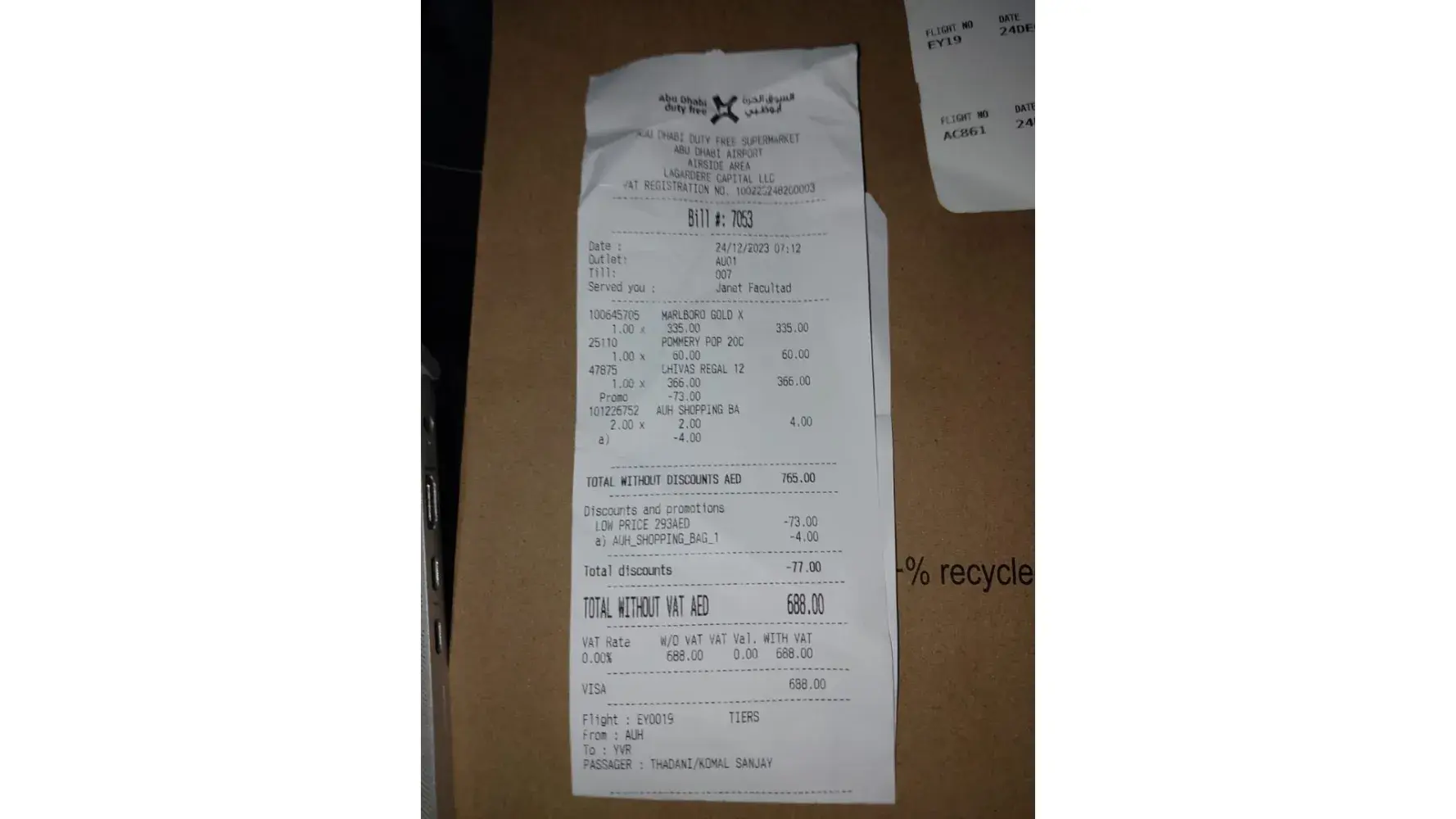 I and my wife travelled from AUH via LHR to Vancouver on 24th December 2023 on EY19 with a connection to AC861. At the security check point our Abu Dhabi Duty Free purchases of Alcohol (Chivas Regal promo pack 2.200 L+ a small bottle of Pommery Pop 20C) was confiscated.