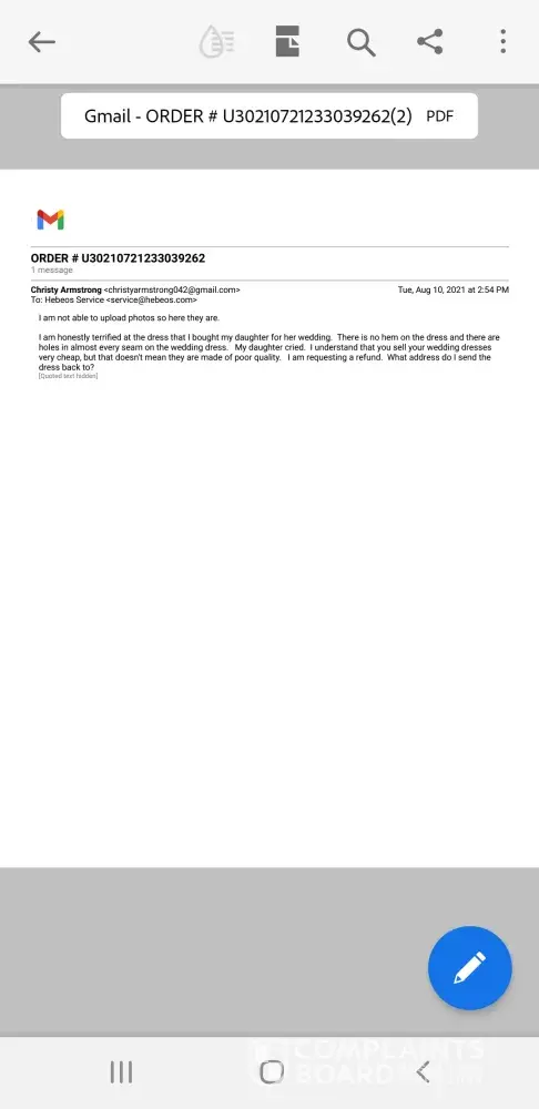 Ordered a wedding dress on July 22, 2021 from Hebeos. When it arrived, it was not hemmed and there were rips and tears throughout the dress. I contacted the company to initiate a return for a refund and they sent me an email telling me to find a local dress alteration company to make some alterations. YOU HAVE GOT TO BE KIDDING ME. ALTERATIONS WILL NOT FIX THIS DRESS. I WANT A FULL REFUND.