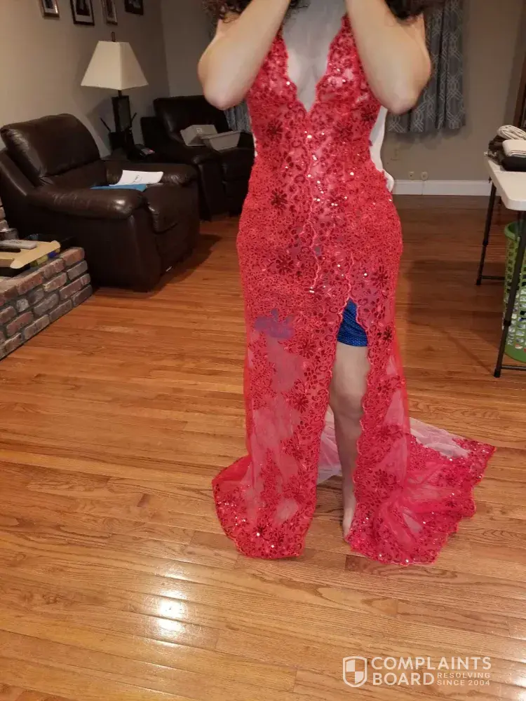 I was very skeptical about purchasing from this company. I should followed my instincts. Never the less we purchased this dress, after numerous conversation with a customer rep on chat. who assured we would get a dark red dress, we received a poor quality bright red, see through dress with a horrible netting and deformed zipper. The company said the color differs under different lighting. well no it does not.