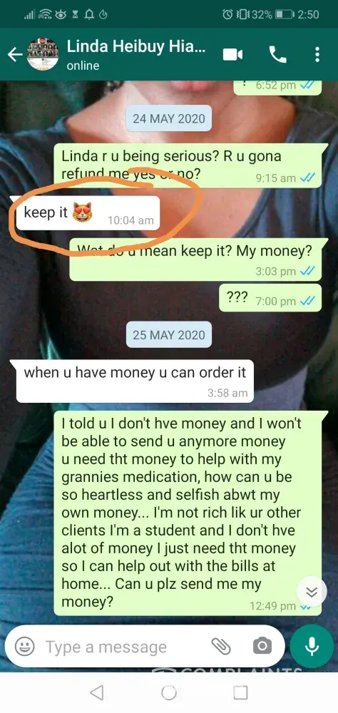N am shocked people still order woth linda... Lets others n report tgeir facebook n whatsapp... Open a case n freez their bank account... We can act on this.