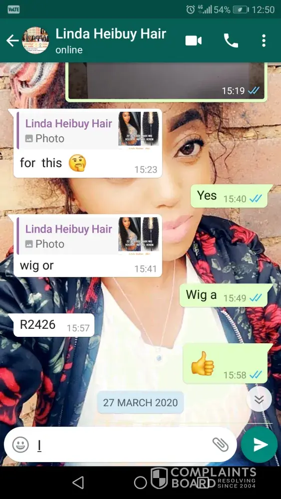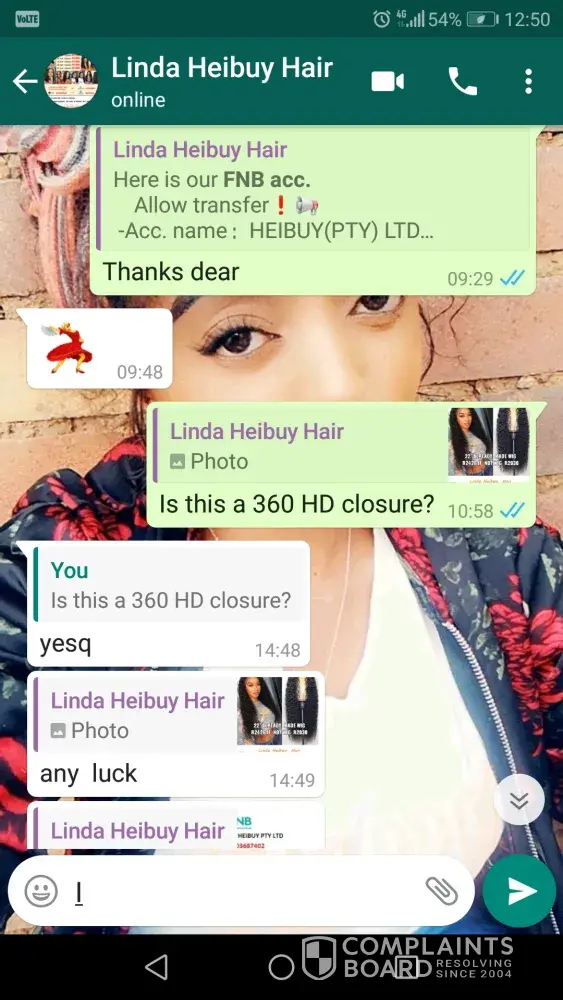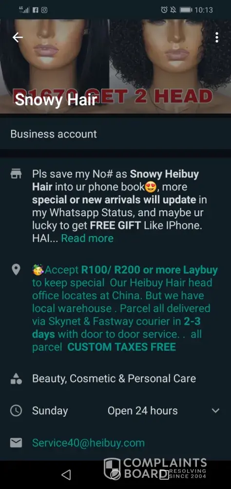 I Amkela Gxwala order hair from hiebuy company holder I ordered from iz Snowy I ordered on the 17th of April 2020 was a laypay then I payed the outstanding balance on the 26th of June i ask her when will i get the hair she said within 2 to 3 working days and it was during weekend the next week on Tuesday I asked her am i able to get the hair on Thursday she said the hair got robbed then i asked a refund she kept on giving me options to take lower price hair mine was 3Oinch with frontal closure i told her no if that it send me a refund she ignored ne and mu messages the next day she said i must wait for 10 ro 15 working days i did and the 15 days was over i asked her when am i getting the hair she said the hair has been shipped to the warehouse the days went i ask for truck number she said i will get on this date then i didn't get it i told my big sister to talk j to her again she came with a story that the hair got robbed again