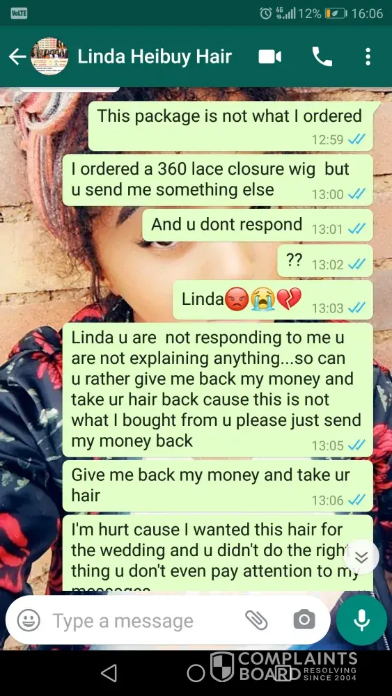 She sent me the wrong parcel as I have ordered a 360 full lace 22"water curl already made wig, but I only got a one part closure and 5 hair bundles... Which is not what I ordered or paid for, I paid R2450 instead of R2426 and when I contact Linda over whatsapp she ignores my texts or only replies"Baby" I am so frantic at the moment as I needed to use the wig for a wedding 😠💔 could I please have my money 💵 back or sort out the problem ðŸ™