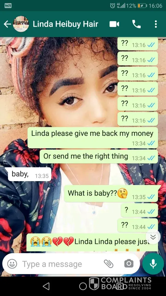 Earlier in this year I laybuyed hair from Heibuy, from a lady named Linda. I was gona finish off the laybuy but then an emergency at home occurred and I am unable to continue paying for the hair until further notice. I've asked her for a Re-fund and she told me to wait 15 days and I did. But still she hasn't given me a Re-fund. Instead she's been so unprofessional and unethical by saying she wants to keep the money for herself. I don't know what more to do this is my first time making any orders from Heibuy.