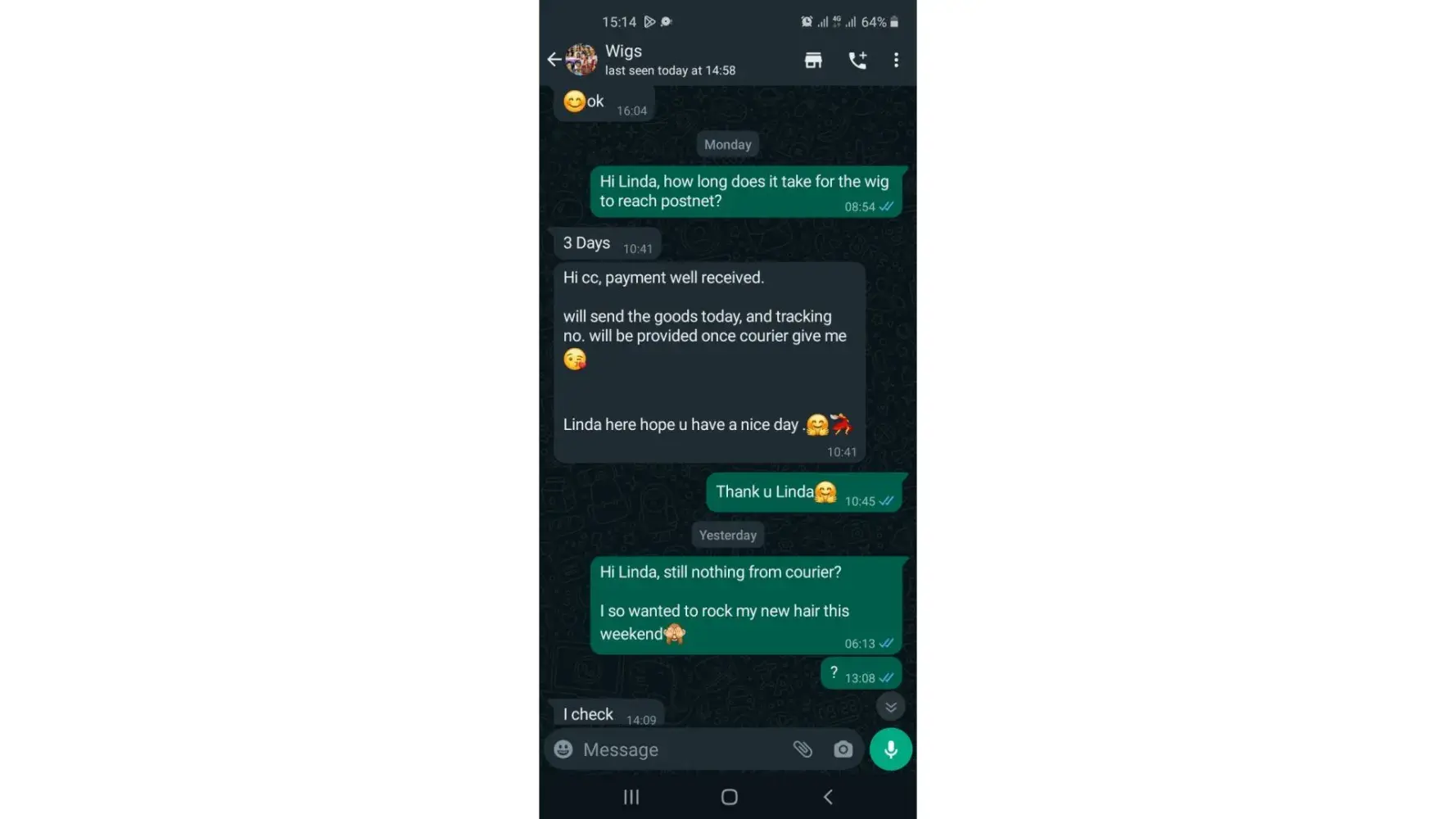 I biught hair from Linda. When I wanted to order she was quick to respond to my text but now that I am asking about my hair she responds after a few hours. And when she responds give short answers like yes, no and today. No full senteces. I just wanted the tracking number. It has been 10 days now that I have been asking for the tracking number. This woman needs to be stopped.