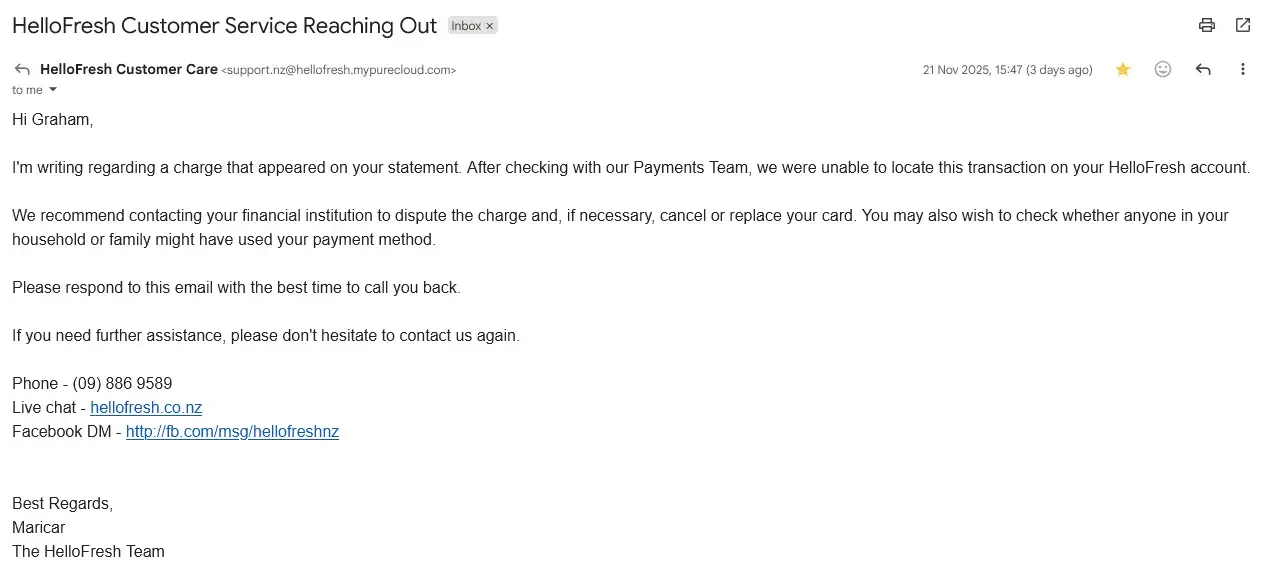 I was using HelloFresh from 2021 till mid 2022 and stopped it once I moved to Oamaru as delivery to my new address was not possible. Last year on December, I happened to use a voucher that I got just to see if it was still valid. I only entered my account details to see how much the delivery would be but I never went through the payment process. Yet, a...