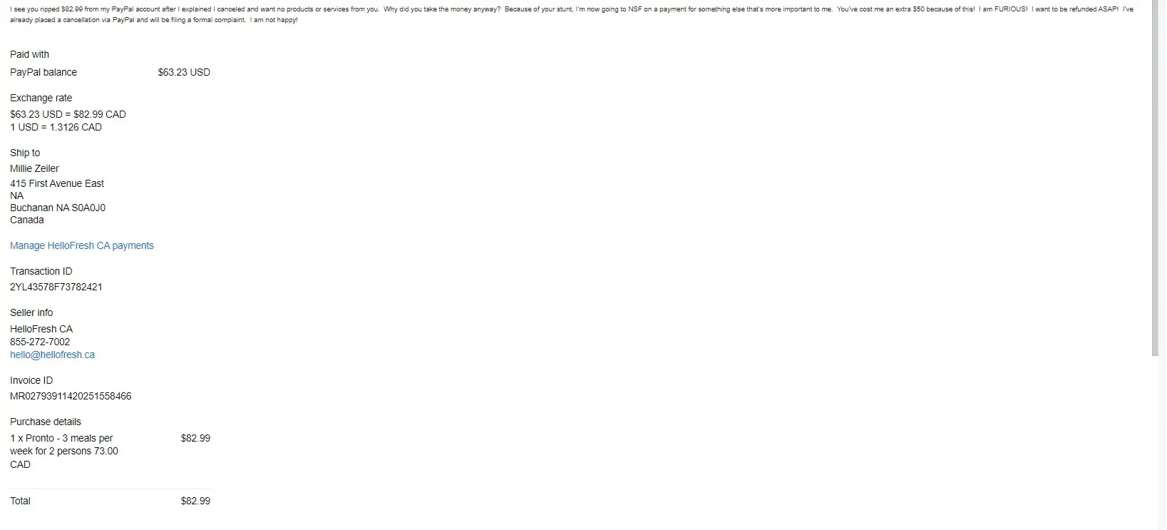 Hello Fresh Canada took $82.99 from me without my authorization - doing this after I attempted to cancel a subscription just seconds after realizing their site somehow subscribed me without my consent.