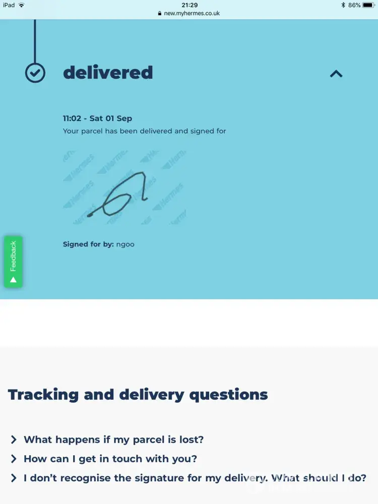 Hermes delivery agent forged my signature to say a parcel had been safely delivered to my address. It is not my signature or anyone I know. The parcel may have been dumped outside or in an unsecure place and now missing. I understand the contract is with the seller and Hermes..but I am concerned about the Fraudulent use of my signature and the fact that the item should have been redelivered instead of dumped.