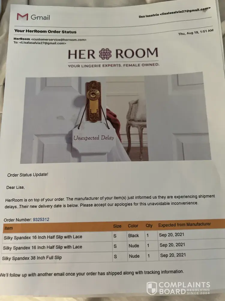 Now, it's passed time when the 2 backordered items were supposed to be sent to me. I wrote HerRoom on chat on their website to find out what was going on. The woman, "Tiffany from Dallas" on the chat said basically, tough cookies...we cancelled your order because you filed a dispute with PayPal...and she had the audacity to lie to me by saying that she could not create a new order number. (obviously, we know this is not true). So, I asked for a discount code for the trouble of this situation and having to place a new order. She said HerRoom does not give out discount codes; (also not true...I got a discount code when I signed up for their emails, which I used on the initial order).
