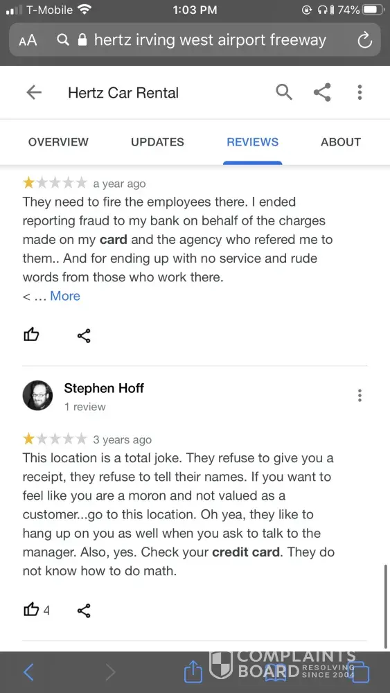 Hertz earns a 1.5-star rating from 16 reviews and 1183 complaints, showing that the majority of renters are dissatisfied with rental experience.