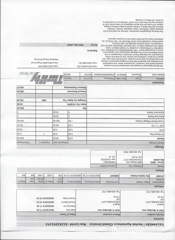 I rented a car from thrifty on aug 22-25. I returned it on time and full of gas, not knowing about a border fee. I went to Indiana to see my sick Aunt. This situation put me in duress because of having a sickness in the family, then the extra fee on the contract. It maxed my card out. I had enough to pay for the regular fees i agreed to. The over the border...
