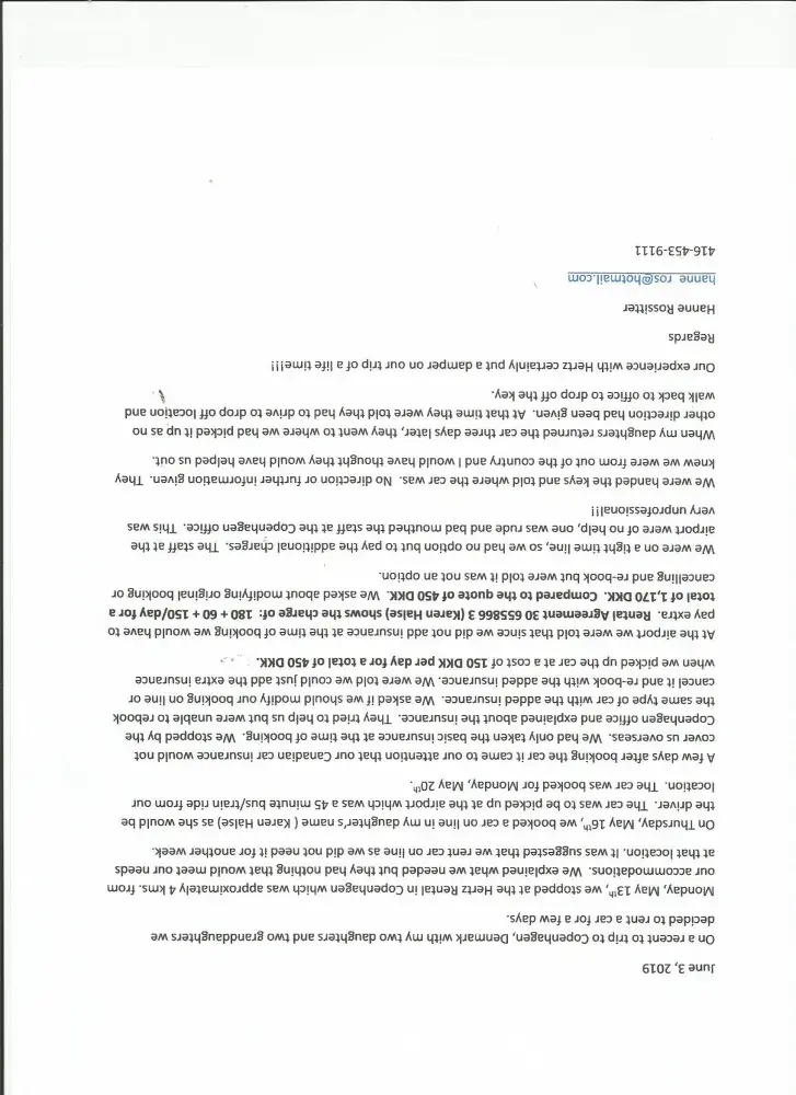 Attached, I have outlined the issue I had when I rented a car in Copenhagen, Denmark where I was on holiday with my family. We were visiting from Canada. I have also attached a copy of the Rental Agreement #30 655866 3 which is in my daughters name, Karen Halse.