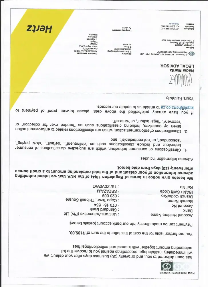 I hired a car from Hertz in Cape Town in November 2015 and signed for and paid the premium to cover all damage to the vehicle. Following the hire a slight indent (with no paint damage) was noticed to the vehicle on the nearside front wing. Hertz wanted to charge me some R5000. This was disputed through MasterCard who removed the charge from account. Hertz are now harassing me for the payment -see attached. I have always used Hertz as a matter of first choice but will not do so in the future