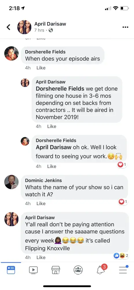 U have a house flipper employees by u.her name is April Darisaw.she has been harassing me an my kids.she has been threatening to do bodily harm to me on social media.She as cause so much Drama with her allegations and Threats.she claims that she is Filming for a show call flipping Knoxville.so since I been getting so man death threats an she's using ur name in the post an comments.i will be seeking help from my attorney am pressing charges For defamation of character.an since she's all ways using Hgtv in her rants I will enInclude you in the lawsuit as well