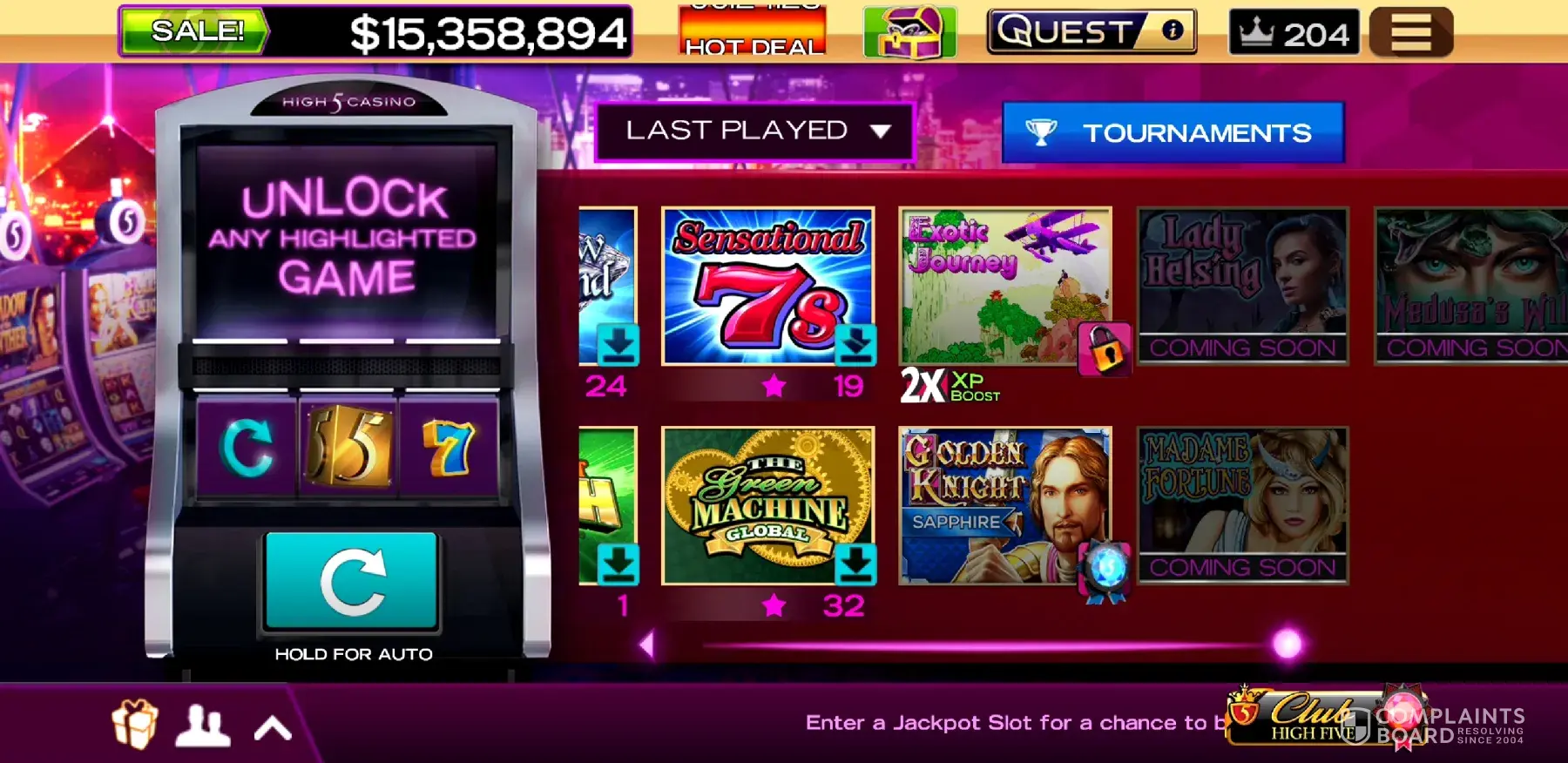 I got a slot machine unlock but I dont have any more unlocks to pick and now I can't play high 5 anymore.