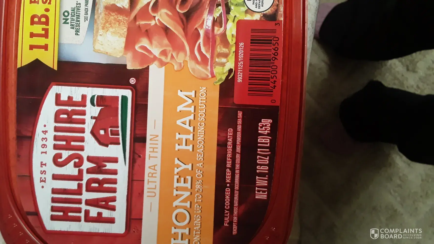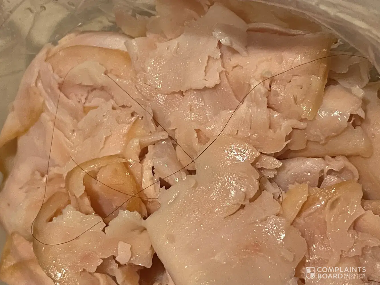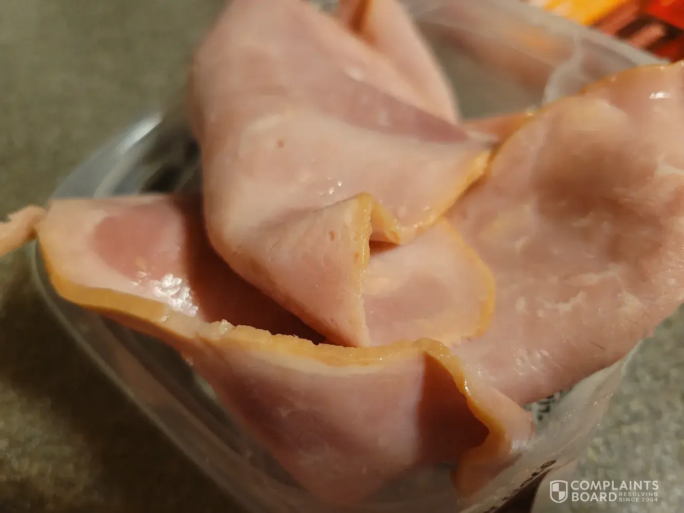 I recently purchased your ultra thin sliced smoked ham and found a large piece of silverskin/gristle in about 30 percent of the slices in the container. My dog was pleased that I couldn't use it for my sandwich. I just thought I'd make you aware. Pictures of product and lot code are attached. Package marker : "Use by [protected] A EST1489/P1463 E31 08:37"