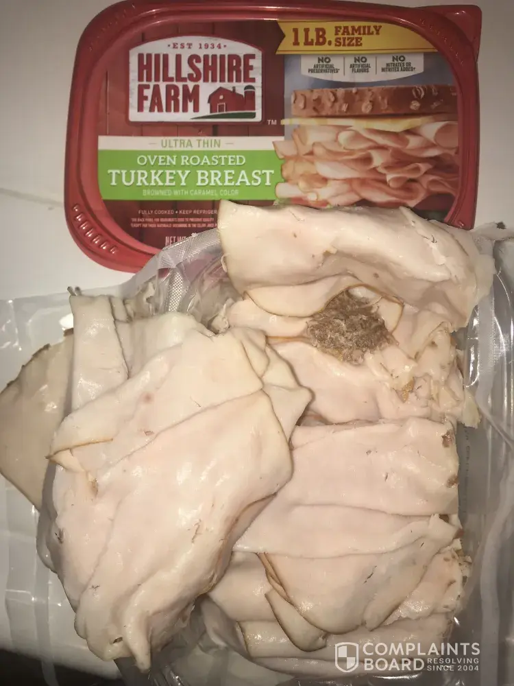 The pictures do the damage justice. I opened a new package of turkey breast deli meat on November 27 and saw an awful sight. I gag every time I look at the picture. It is absolutely disgusting! I am highly considering not purchasing "meat" from Hillshire any longer.