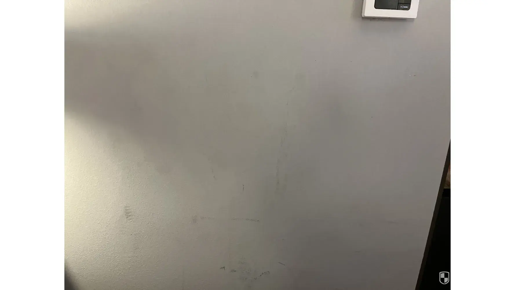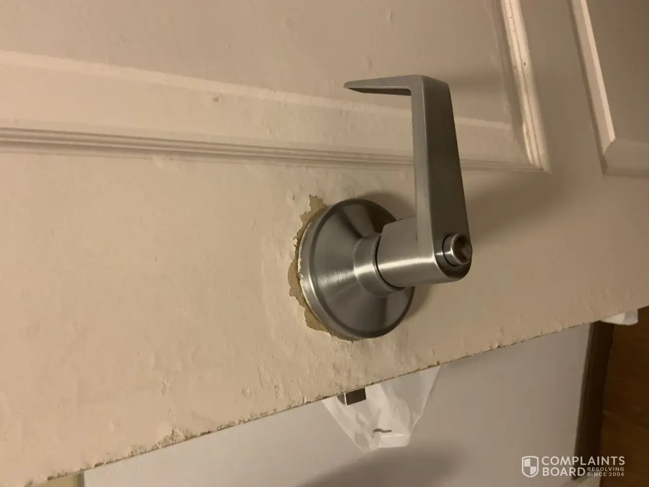 7. An informational plaque previous hung between the elevator doors on the lobby floor was missing. The remnant of glue remained on the wall.