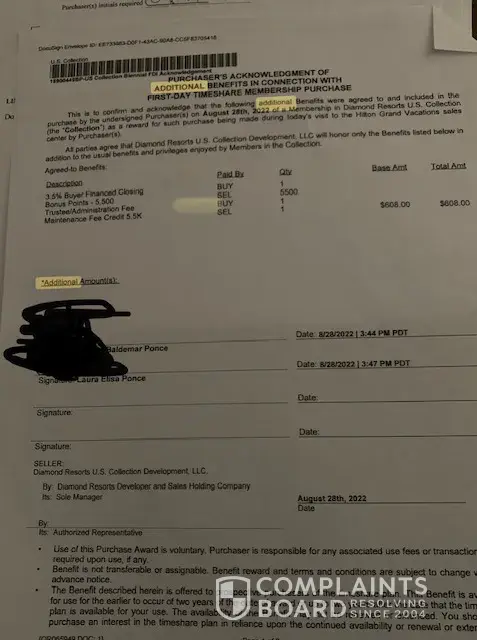 Time share contract is not able to be used/access due to Hilton not applying my additional benefits as stated at time of purchase. We were promised on paper to get credit of 608 dollars for Fees during the first year use. We purchased 8/28/22. We would not be able to use timeshare due to the timing of purchase and length of time it takes to go through escrow. So we were given this benefit.