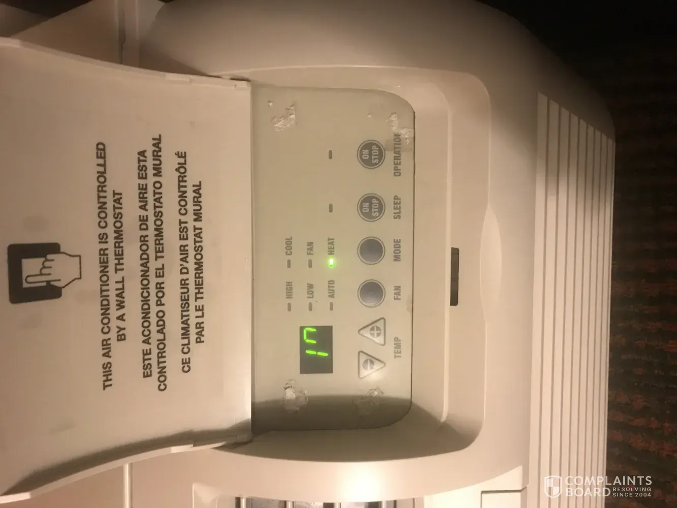 The room itself has a broken heater with unresponsive controls and display. There is also cold air coming from below the heater with a wind noise howling around unit.