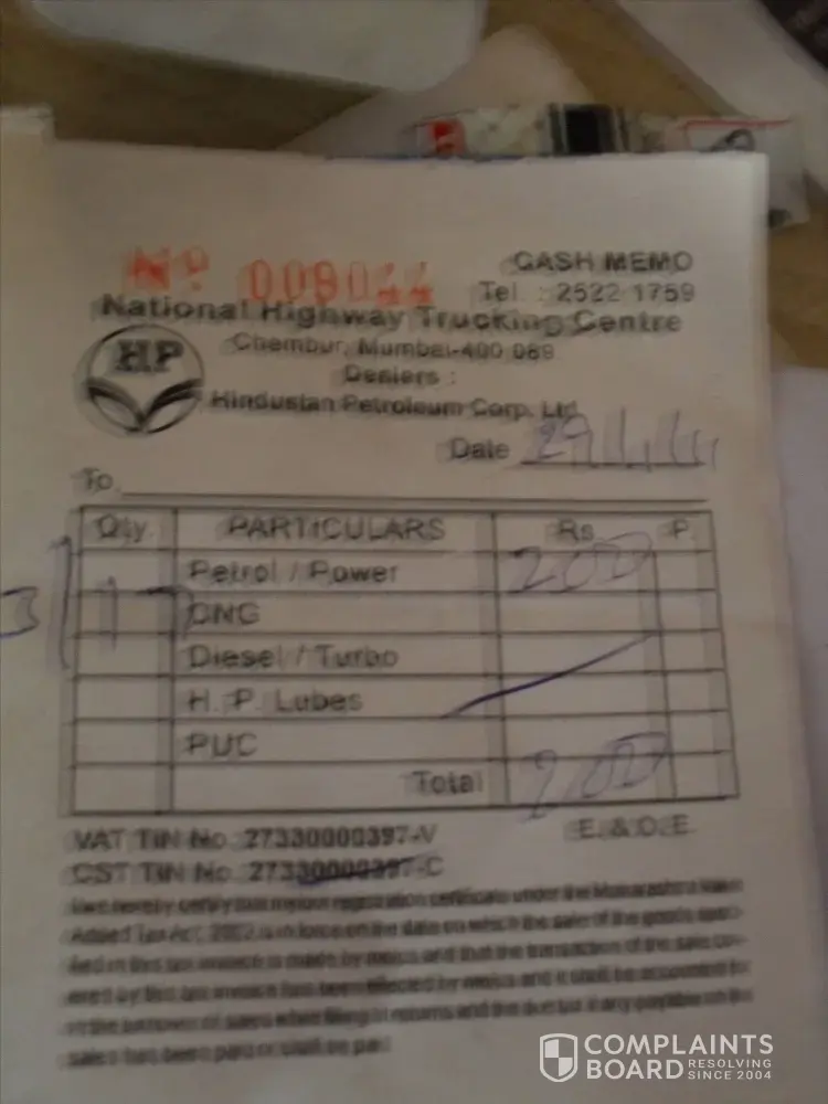 I am a citizen of Mumbai chembur. I am a regular customer at petrol pump. The branch of the petrol pump is HPCL National Petroleum Trucking Center. I fIlled petrol on 29 Jan 2011 worth 200 Rs cash memo number 009044. That evening my bike started giving problem and some how i reach office. The very next day i took my bike to a garage and was surprised to see that more that half of the petrol had water in it ! I had to get the tank cleaned and get pay 150 additional charges and causing inconvenience. In spite of paying so high price for petrol and getting such adulterated petrol has come to me as a shock. I demand action and compensation for the inconvenience caused to me.