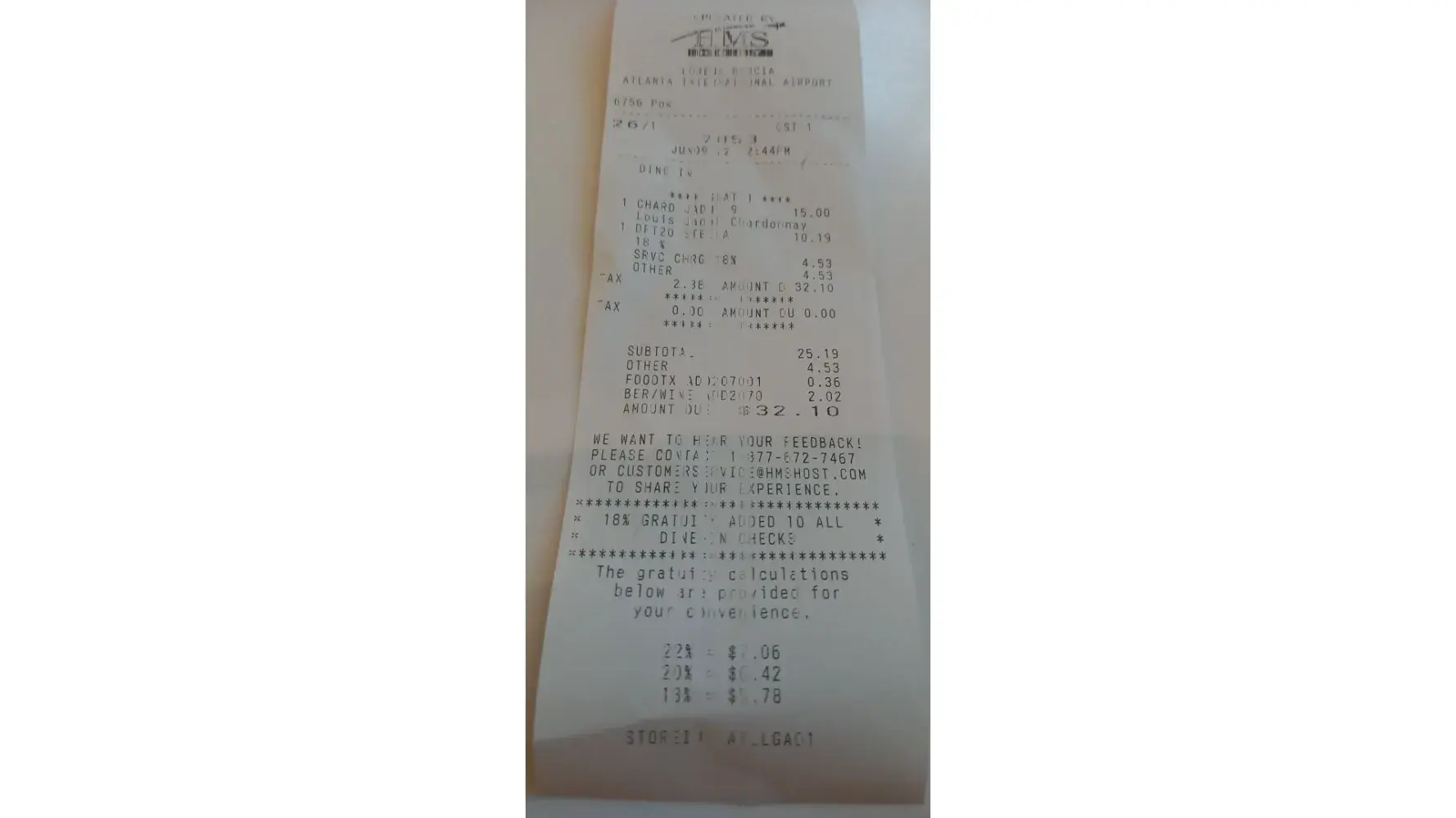 Was not write... And the waitress don't gave a menu, we just asked for a drink.. Total price $32 it's a joke, it's a theft... At atlanta airport, see the recite... Never come back on this restaurant and tell at everybody, I know to stay away...
