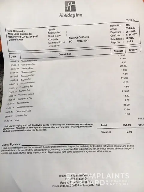 I am an IHG Gold Reward Club member, number PC [protected]. I checked out of the Holiday Inn Sacramento Rancho Cordova, located at 11269 Point East Drive, Rancho Cordova, CA 95742, this morning, concluding a five-night stay, confirmation number [protected]. I have stayed in the same hotel in room 205 for five days each month since January. I plan to travel to Sacramento for months to come, have reservations for June, and had planned to stay at the same place.