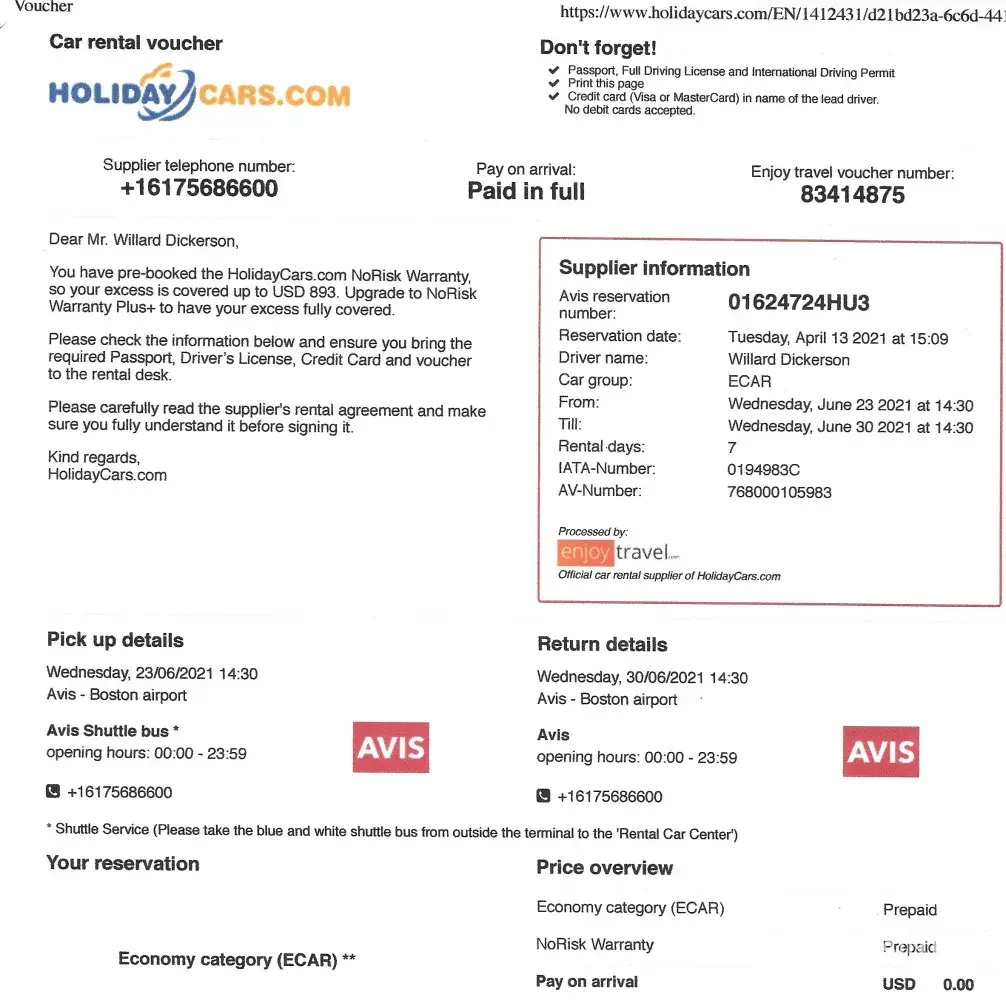 I am a permanent resident of Hungary. On April 13, 2021, I booked a rental car through HolidayCars.com with Avis. I was to pick up the car at Logan Airport in Boston on June 23. At the time I booked the car, I paid the full price of $310.64.