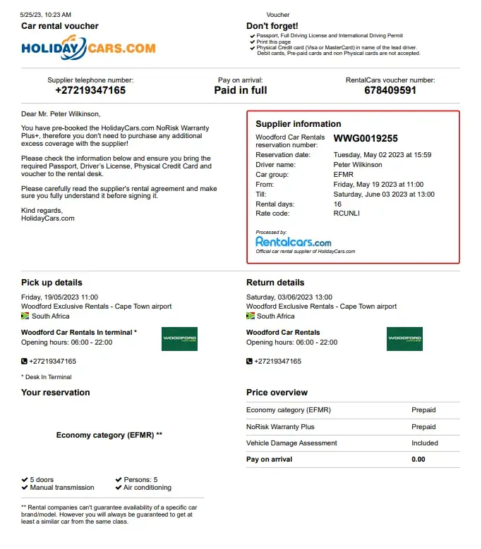 "You have pre-booked the HolidayCars.com NoRisk Warranty, therefore you DO NOT need to purchase any local additional Super CDW insurances"