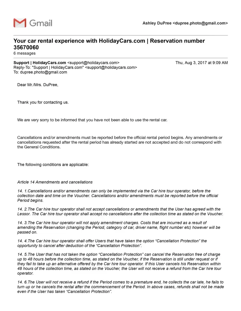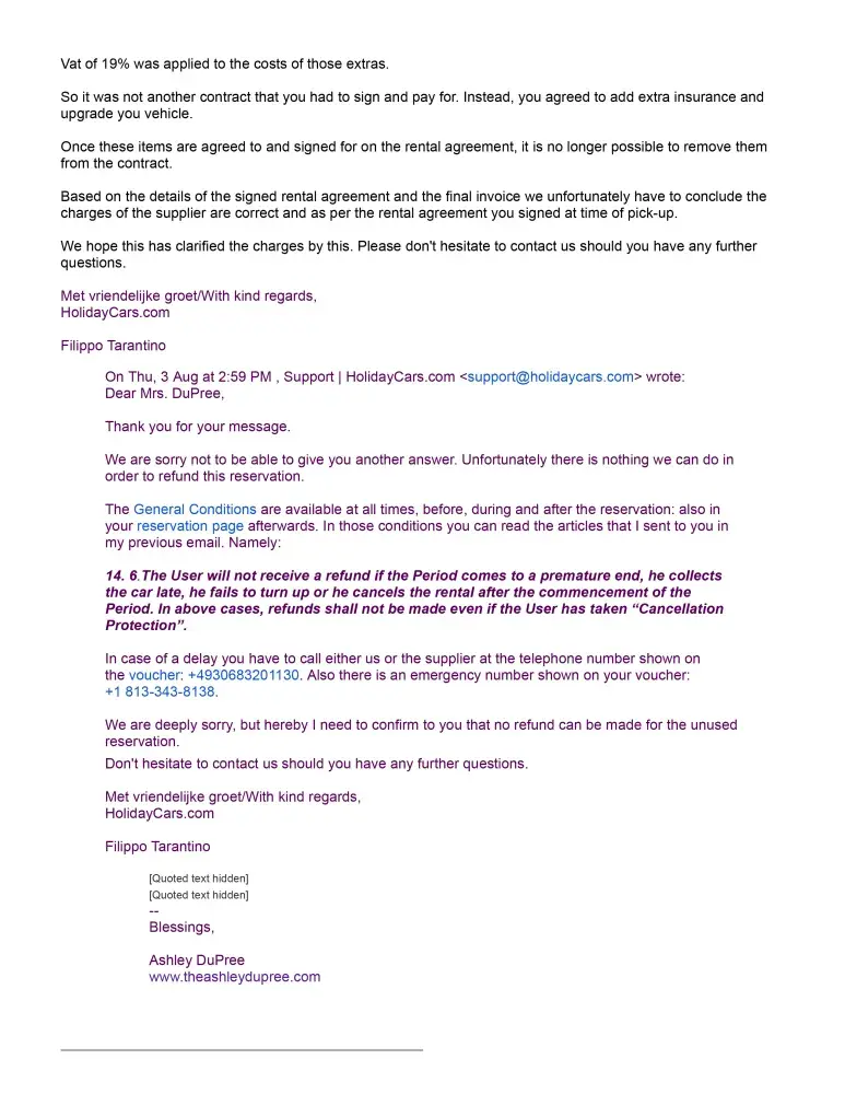 I cannot say that the experience was positive for us but eventually Holidaycars.com became "sensible" again without us having to push further into a legal lawsuit.