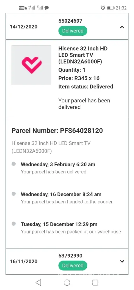 I'm not happy with the service I got regarding hisense TV I ordered on the 15th of December, as my order has not been delivered yet and to top it up your consultants been rude and give me false information and what make me more furious is that I've calling doing follow up but I haven't got the feed back till yesterday when was tracking my order and it shows that it was delivered @ 6:30 am and when I call the consultant said it was delivered @ 8:30 times do not correspond and they can't even see who the driver was