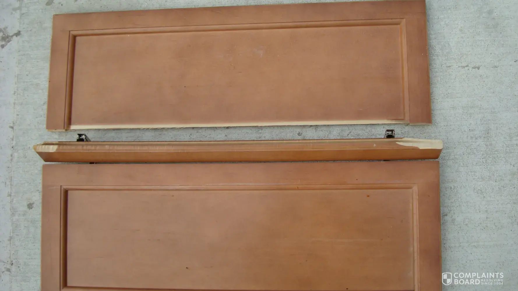 Unfortunately, many problems developed from poor quality cabinets to lack of important “in stock” selection to complete the project smoothly. For example, the Wadsworth Bay cabinets appeared to be produced of far more inferior quality than the original cabinets purchased, resulting in many exchanges creating delays and disruption of the installation process, as per photos attached.