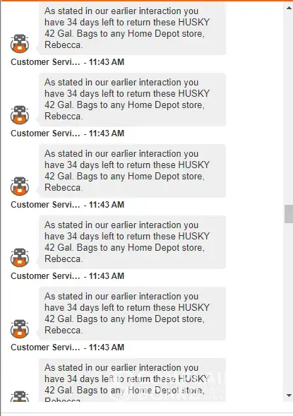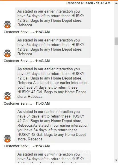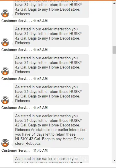 I have chatted with a rep from Home Depot and I was not able to see the # of days showing on his reply so i asked again if how much time left for the return period however he sent me a character ^^^^^^ and ask me if i know how to read. THIS IS RIDICULOUS! He did not stop there. He sent me the same messages 30 times! Home depot, pls do quality assurance with your rude agents. I'm spending a lot in your platform, and this is what I get?