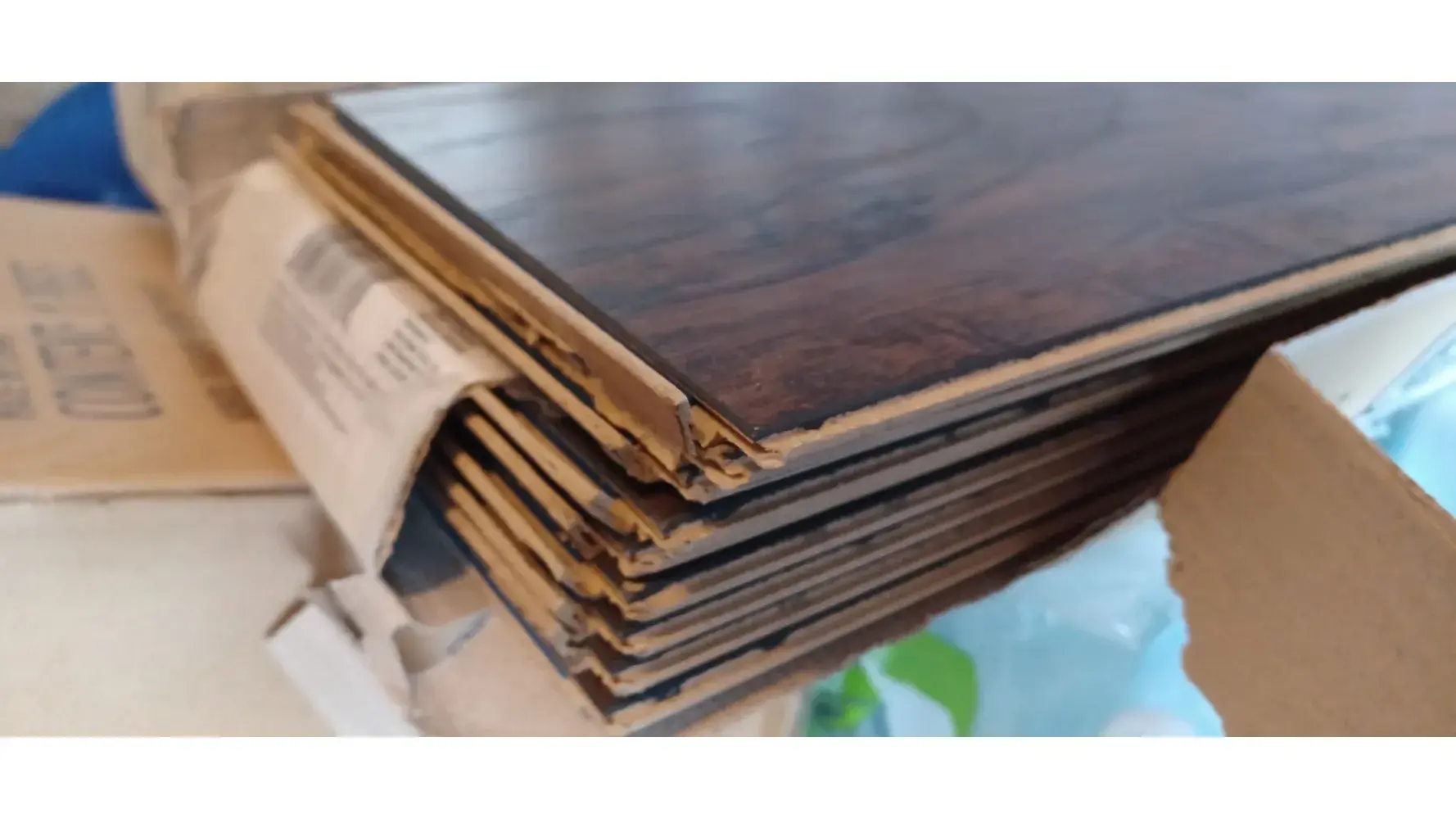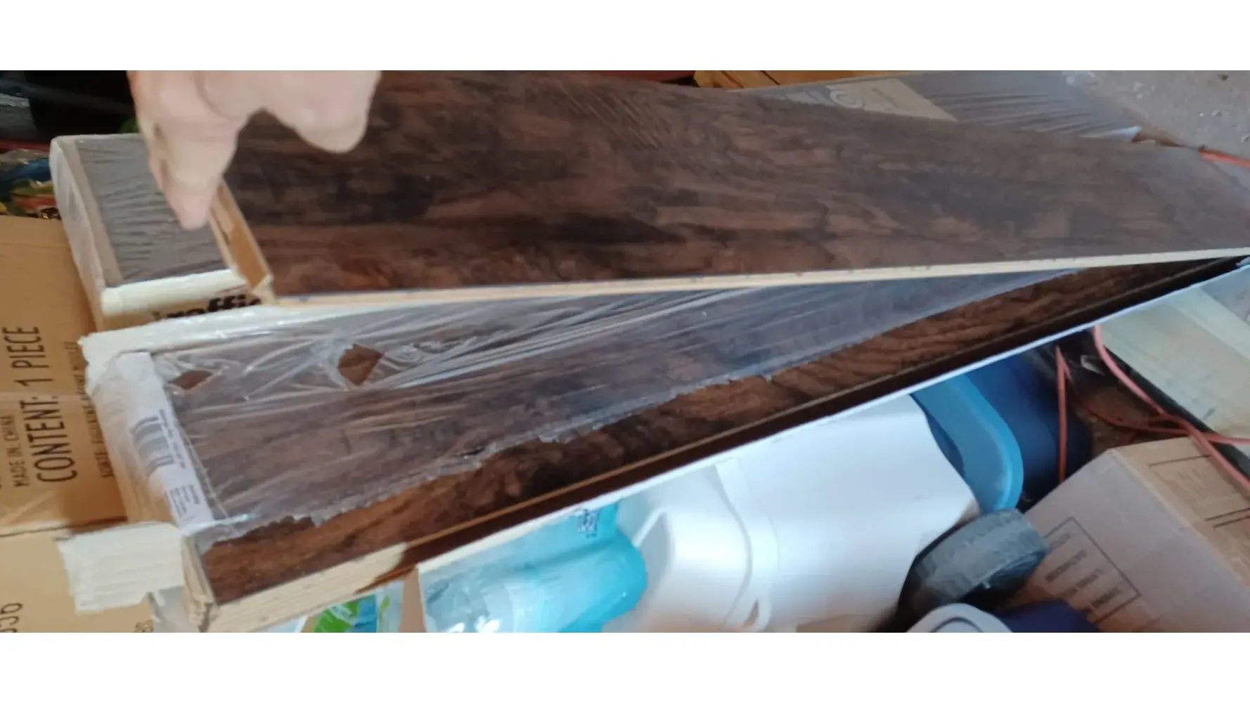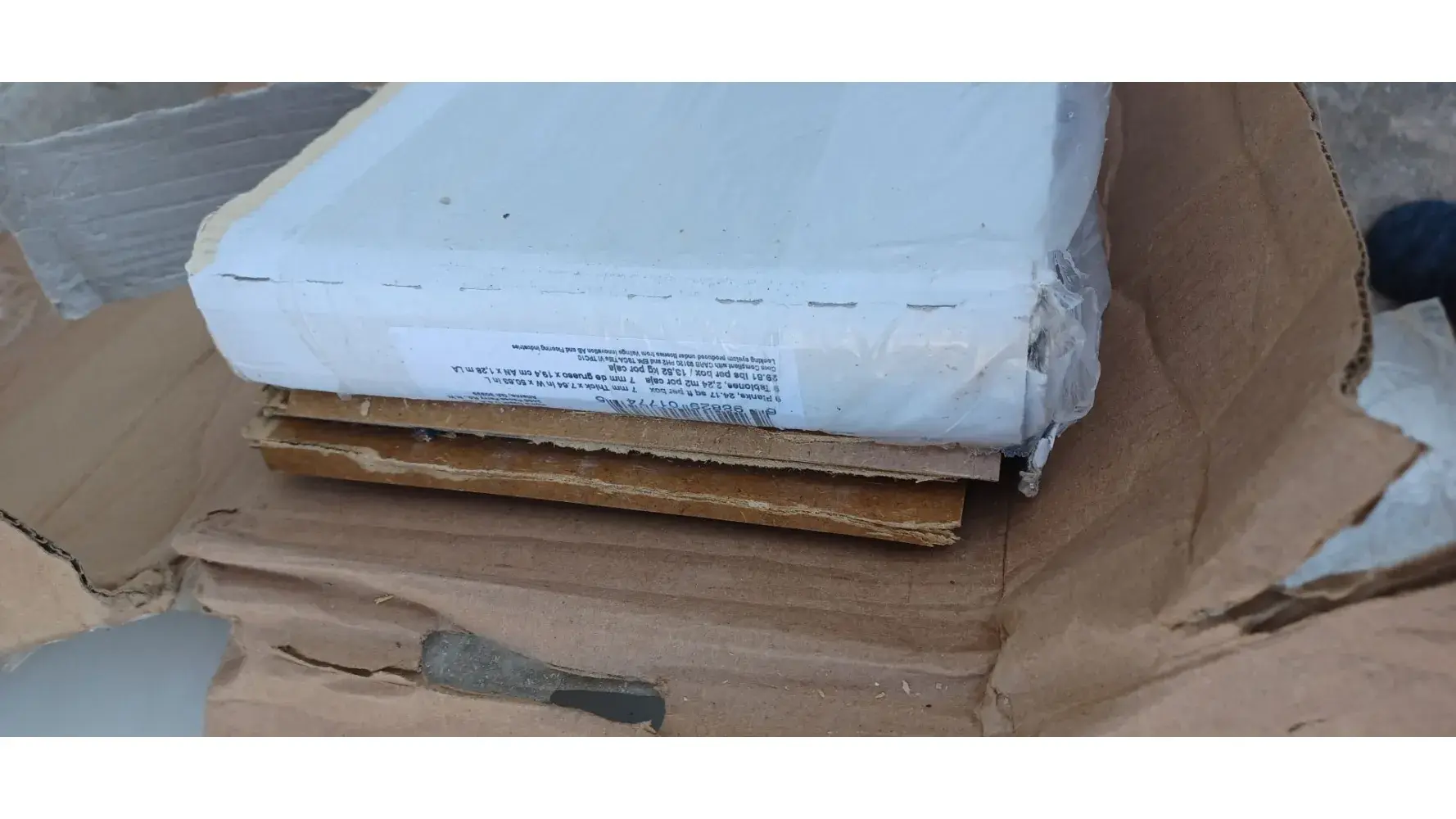 We had to purchase additional flooring to replace some of the original order that had damaged pieces. It was a week late just like the original order causing delays for the contractors. This is what the two boxes looked like when I opened them. They left it outside the garage at 630 AM and signed for me and I can see why. It appears that they threw or just dropped the boxes on their ends. One whole box, with the plastic wrap torn open is useless.