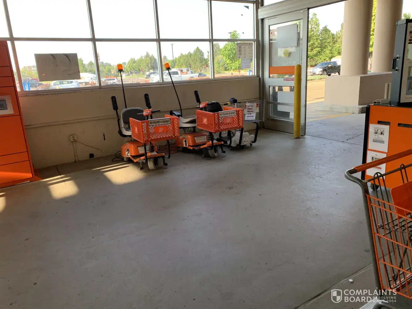 Store at 12171 Sheridan Blvd. Broomfield CO Two complaints. 1. There are 3-4 electric handicap carts at the entrance and every time I try to shop they are out of order. This has been going on for months. I end up shopping at Lowe's because their carts are always working. I talked to a Depot manager who said they had parts ordered. Still the same week...